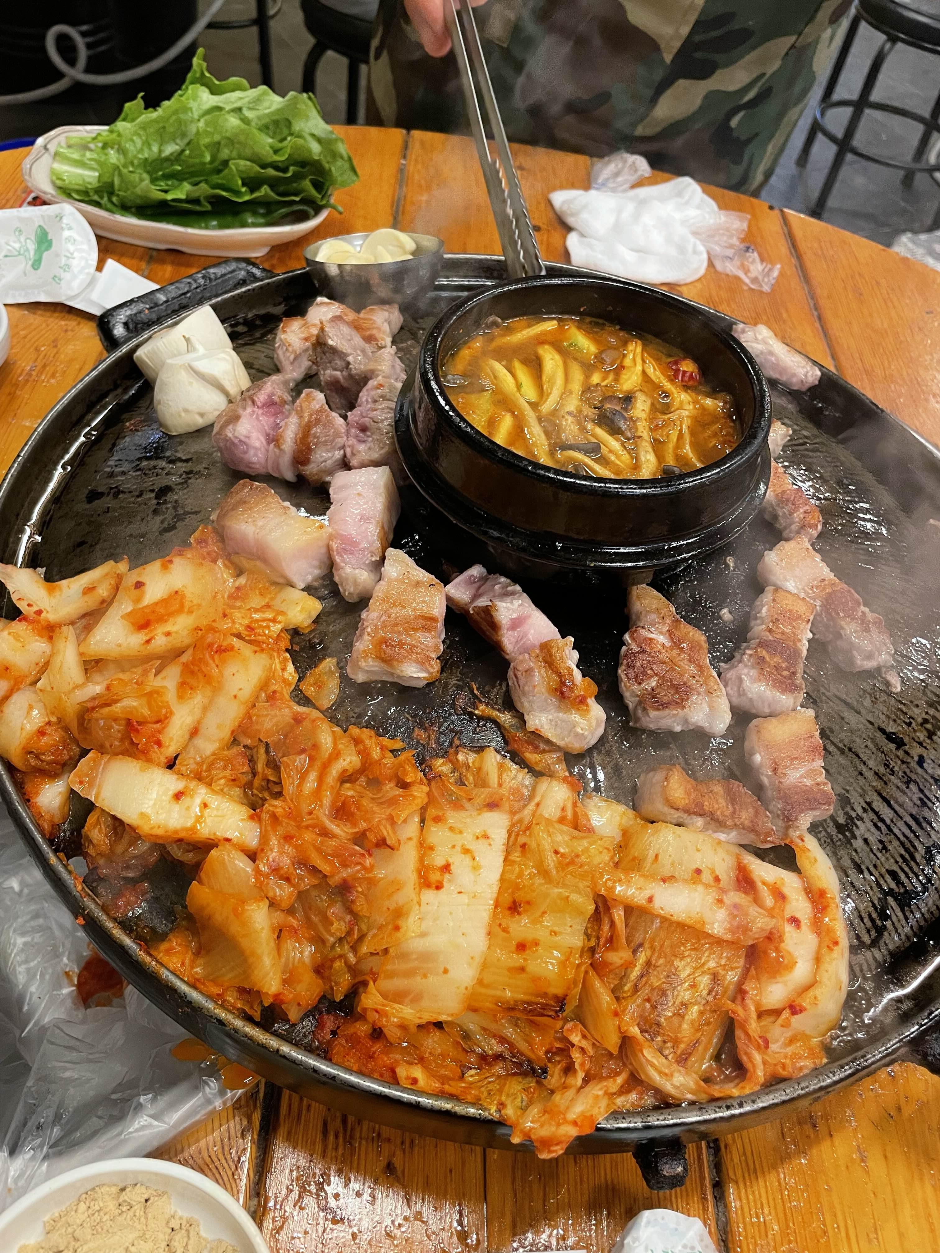 솥뚜껑 같은곳에 김치올리고 고기 올리고 버섯올린다
