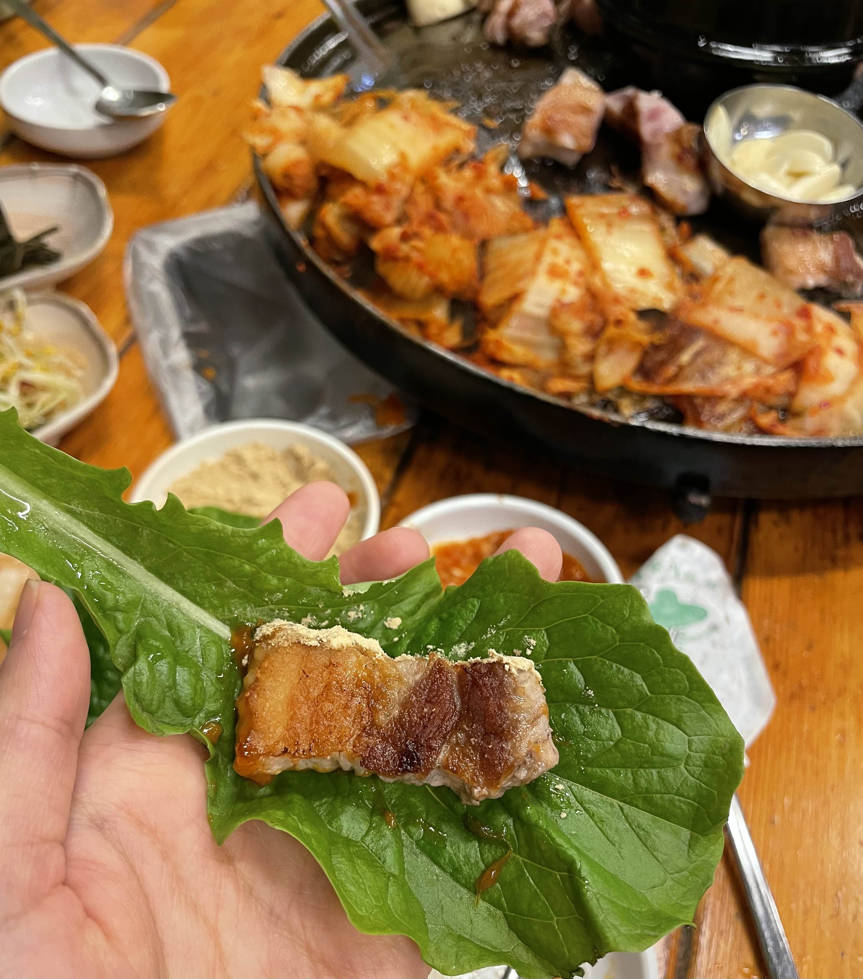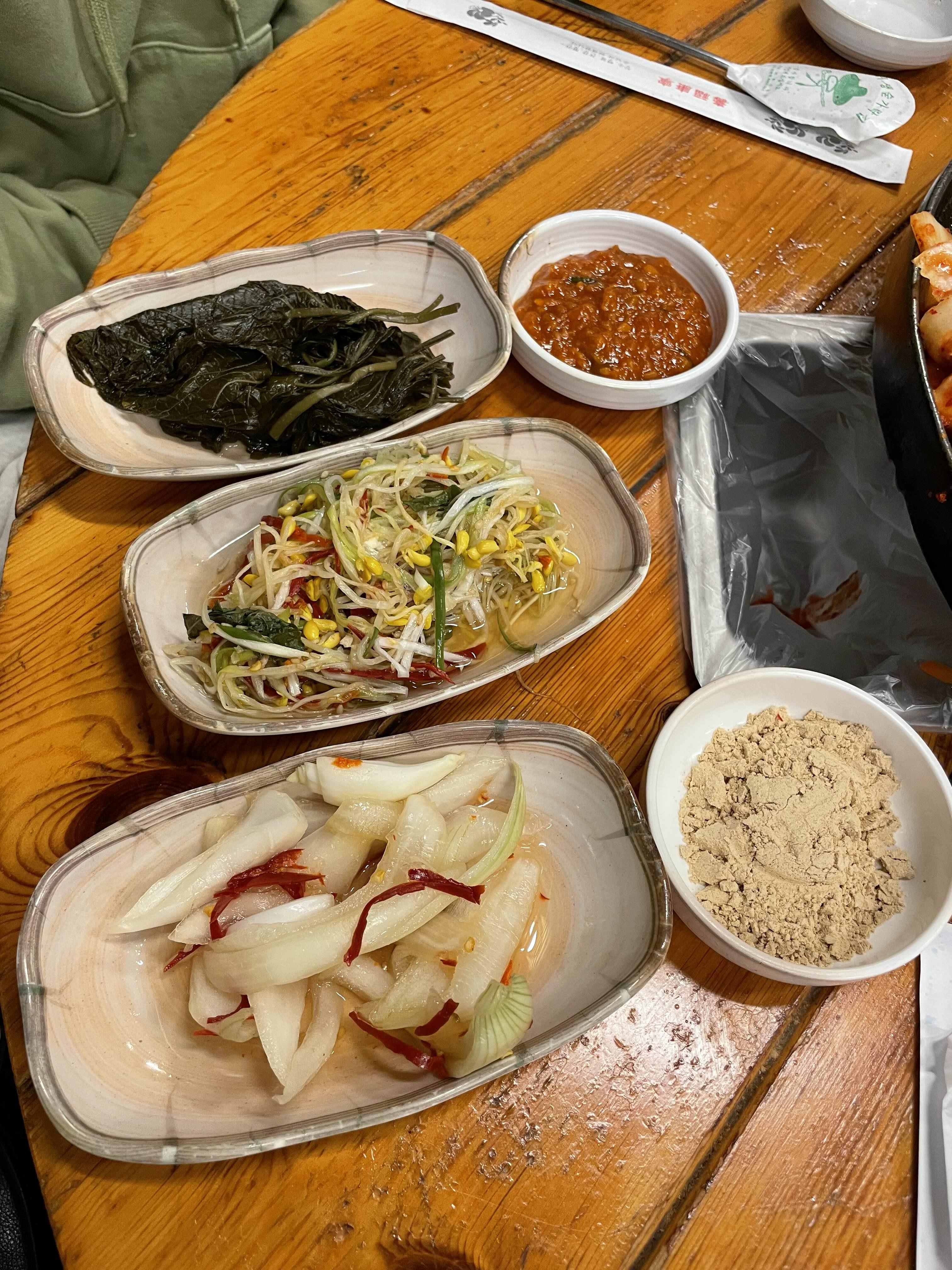 명이나물에 콩나물 무침 양파무침 올리고 고기를 콩고물에 뭍인다음 된장을 찍어서 구운 김치를 올리고 앙